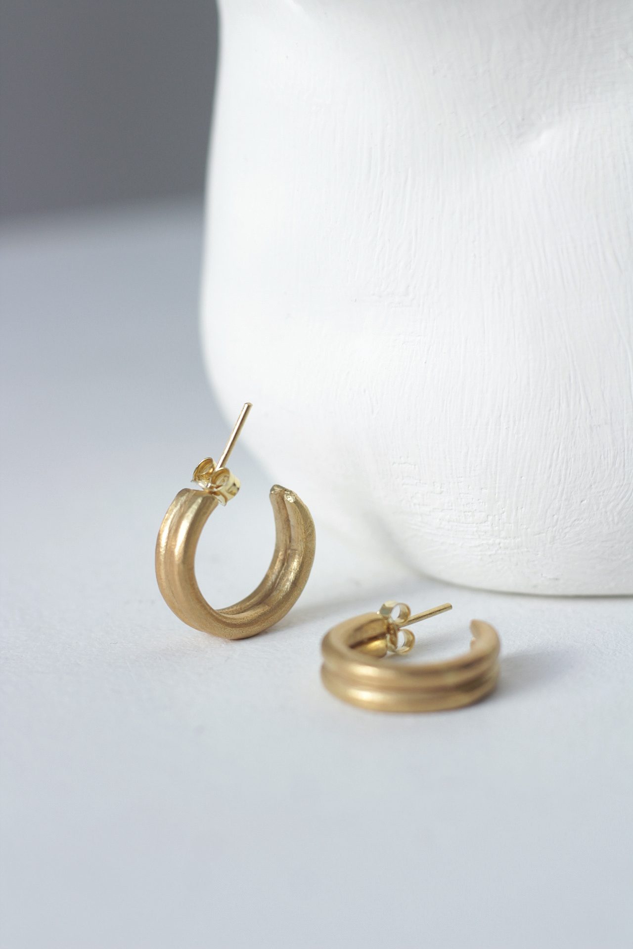 Pendientes Eir de latón bañados en oro de 3 micras, también disponibles en plata. Cierre a presión y de un tamaño aproximado de 2 x 2,5 cm. Diseñados y elaborados a mano por Thais Blume. Los pendientes Eir forman parte de la colección Nórdica, lanzada en enero de 2024.